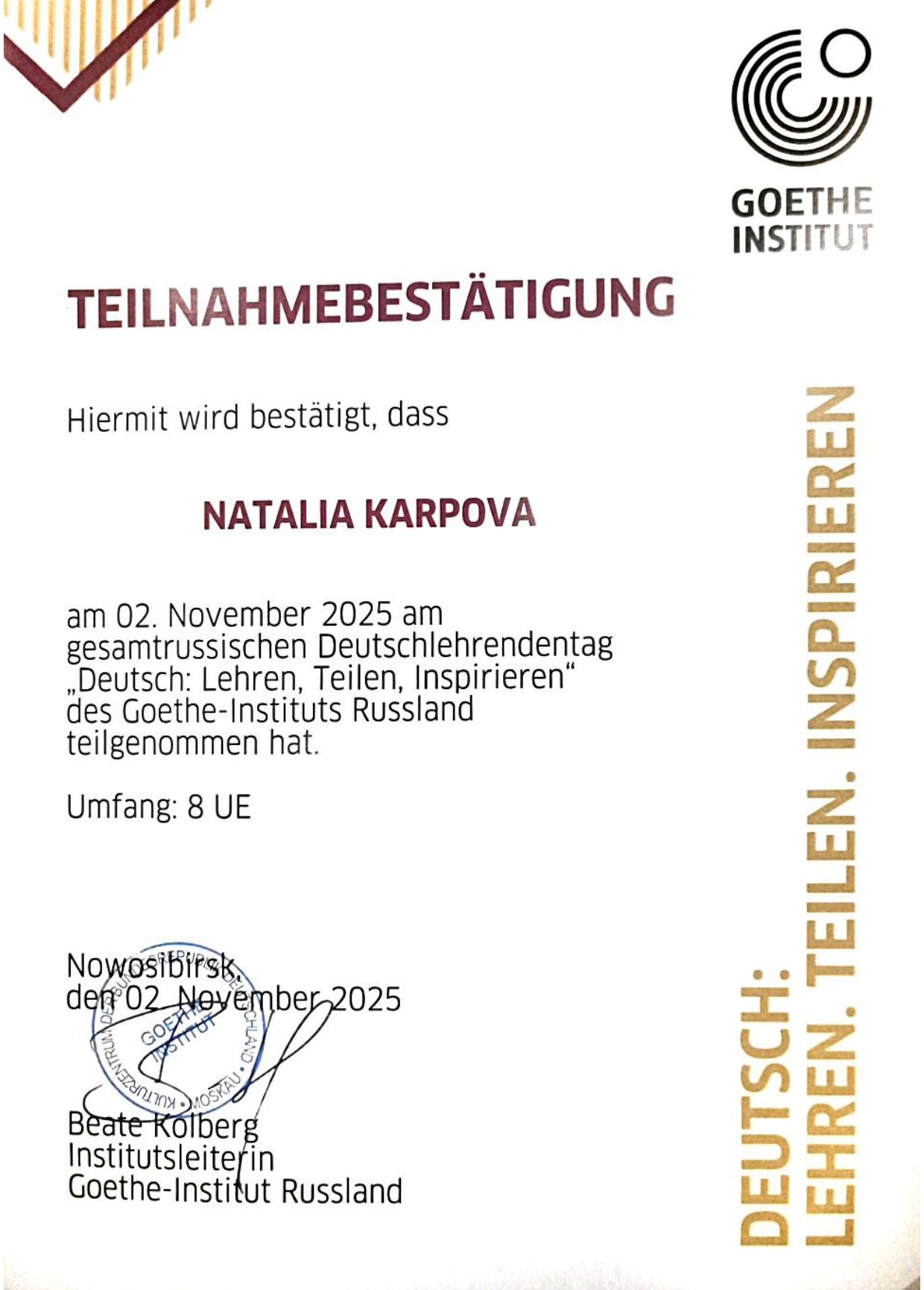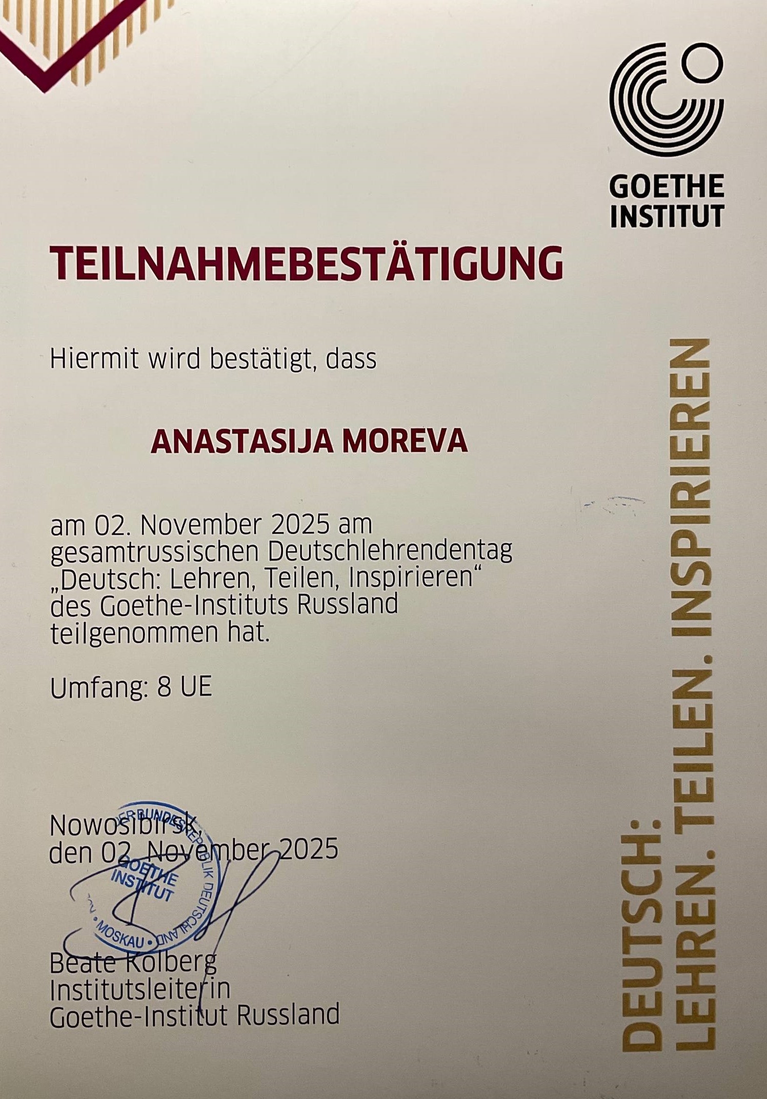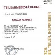 2 ноября преподаватели немецкого языка ФИЯ ТГУ Н.А. Карпова и А.В. Морева стали участниками конференции "Немецкий язык: обучаем, делимся, вдохновляем" (Deutsch: Lehren, teilen, inspirieren) при поддержке Гёте-Института для учителей и преподавателей немецкого языка в Новосибирске. Конференция проходила также одновременно в Москве и в Санкт-Петербурге.