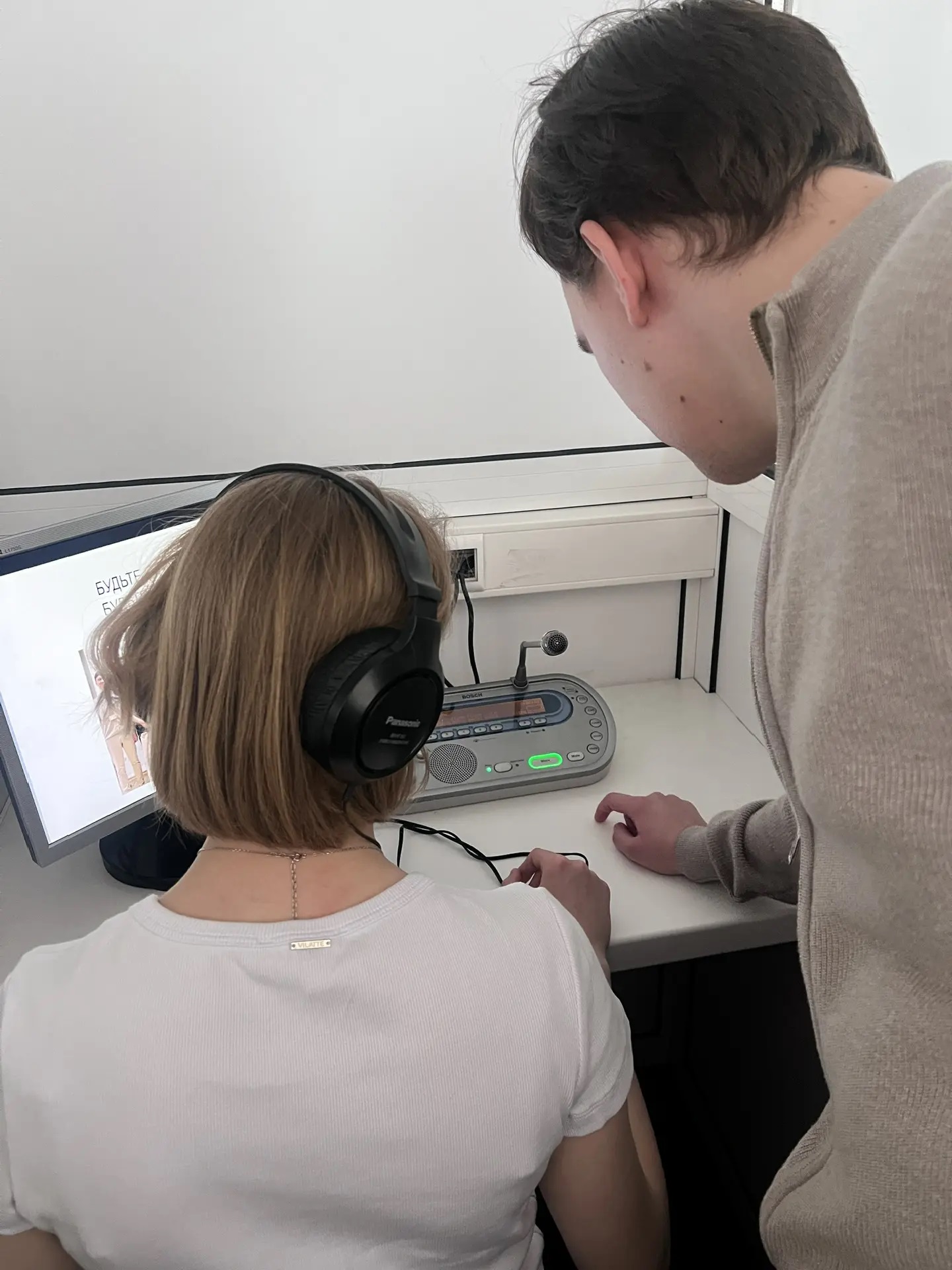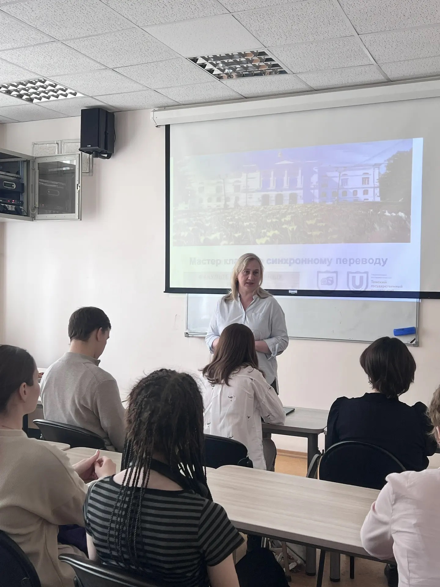 1 апреля на факультете иностранных языков состоялся мастер-класс по синхронному переводу. Будущие абитуриенты получили уникальную возможность попробовать себя в роли синхронистов. Провела мастер-класс опытный наставник - Надежда Ивановна Маругина, доцент ФИЯ, вместе с действующими профессионалами своего дела - магистрантами второго курса. Гостям не просто рассказали о тонкостях профессии, но и дали поработать в настоящей кабине синхронного перевода. Десять абитуриентов освоили специальные техники для развития «многозадачности» мозга, необходимые синхронисту. Попробовали свои силы в режиме реального времени, переводя звуковой поток следом за диктором. Услышали из первых уст опыт студентов, узнали о подводных камнях и секретах мастерства. Пока это был тренировочный формат, но кто знает, возможно, именно с этой пробы начался путь к будущей блестящей карьере.